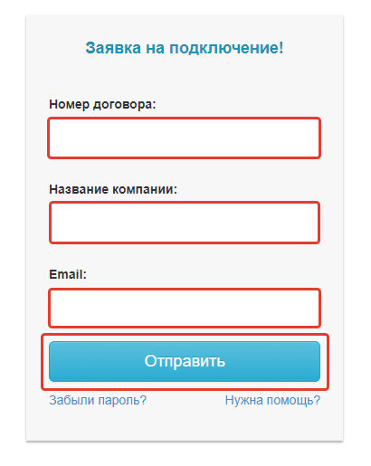 - Кликаем на эту этой ссылку и нам откроется форма заявки на подключение. Здесь нужно ввести номер вашего договора, название вашей компании и электронный адрес. Запрос на подключение будет отправлен после нажатия кнопки «Отправить»